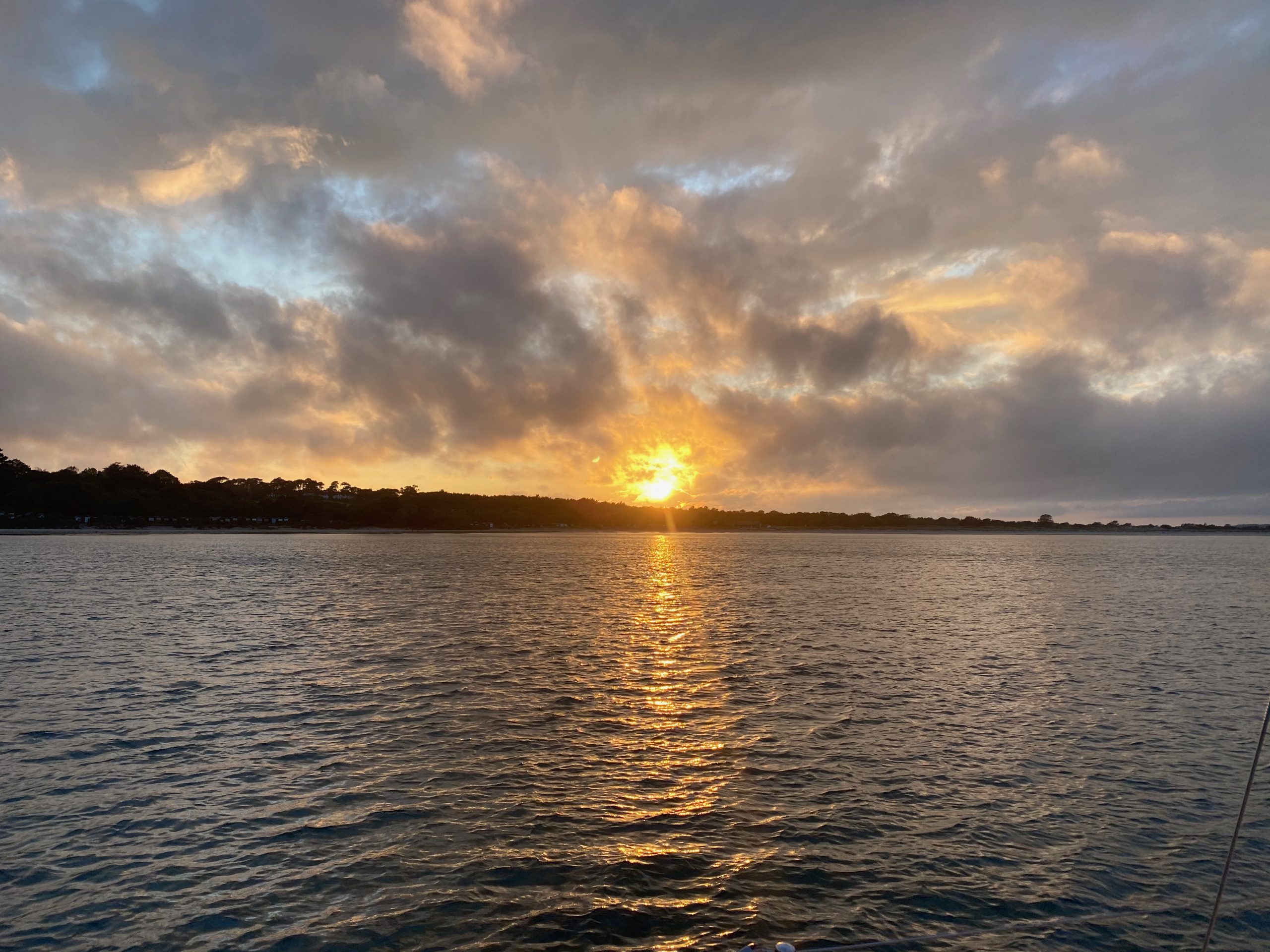 There was a brief glimpse of the setting sun as we dropped our anchor in Studland Bay and after the squalls had passed it was lovely and calm at last.
