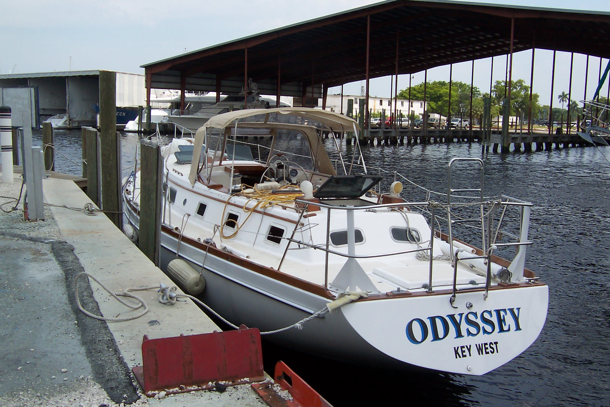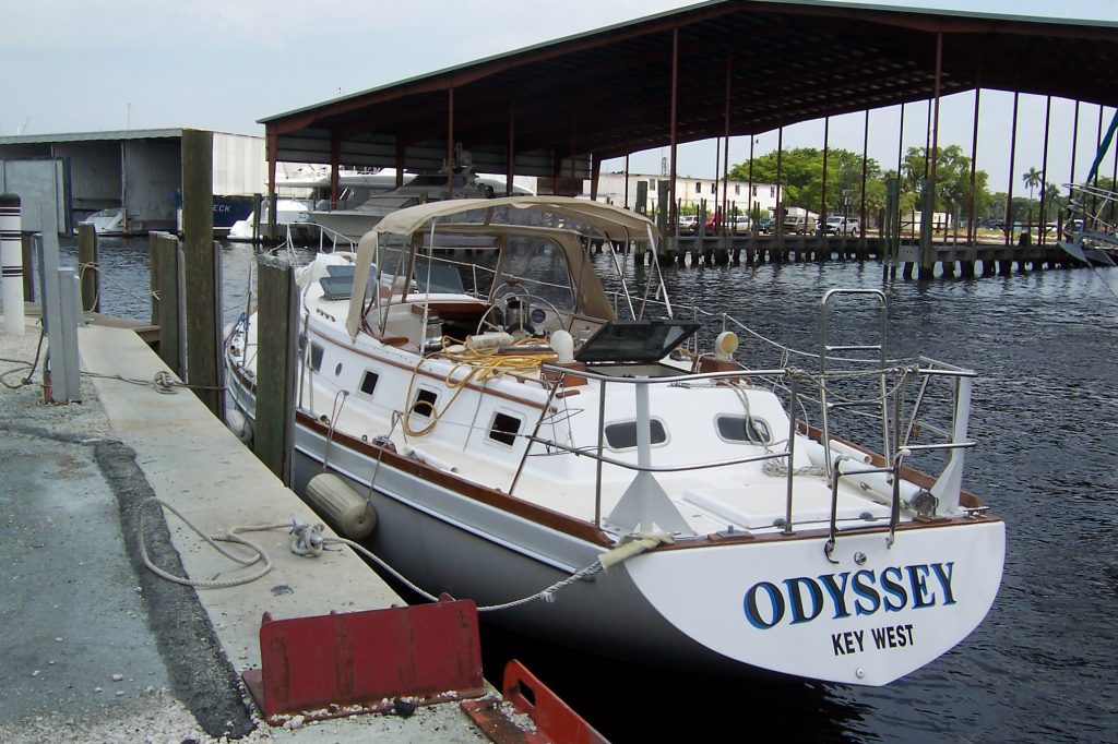 Today dawned bright and clear as the day of Odyssey’s conversion from sail to power. I arrived at the dock to find Rick (the rigger) and Cap’n Lyle (the dockmaster) ready and waiting to move the boat round the corner to where a rather large crane was waiting to rip the rig off. Lyle asked if I wanted to drive but I declined, preferring to leave it in his capable hands.